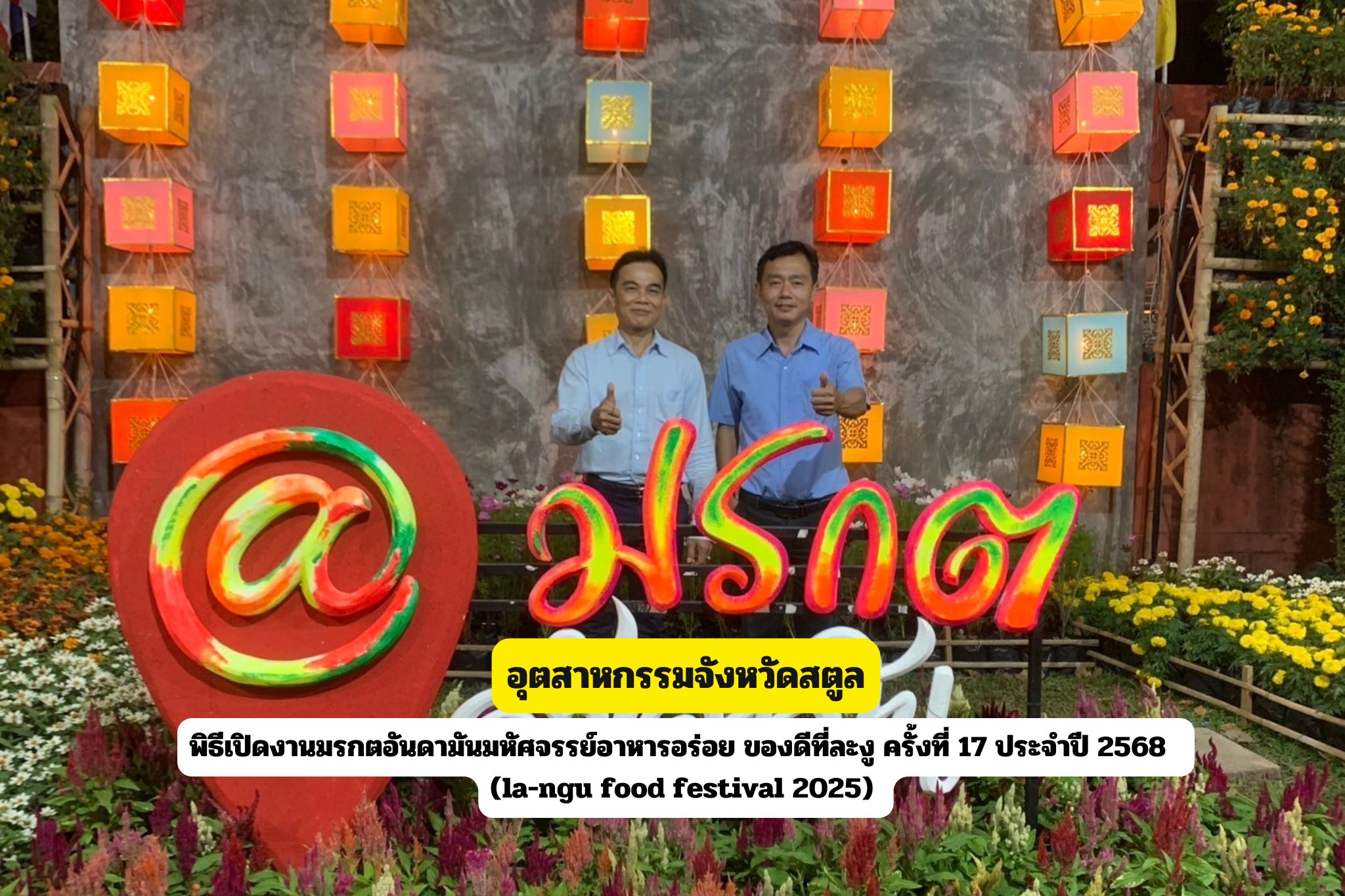วันจันทร์ที่ 10 กุมภาพันธ์ 2568 เวลา 17.30 น. นายสมพร ทองคำ อุตสาหกรรมจังหวัดสตูล พร้อมด้วยนายตรีภพ พินันโสตติกุล หัวหน้ากลุ่มส่งเสริมและพัฒนาอุตสาหกรรม ร่วมเป็นเกียรติในพิธีเปิดงานมรกตอันดามันมหัศจรรย์อาหารอร่อย ของดีที่ละงู ครั้งที่ 17 ประจำปี 2568 (la-ngu food festival 2025) ณ สนามกีฬาตรงข้ามเทศบาลตำบลกำแพง อำเภอละงู จังหวัดสตูล โดยมี นายศักระ กปิลกาญจน์ ผู้ว่าราชการจังหวัดสตูล เป็น ประธานในพิธีเปิดงานมรกตอันดามันมหัศจรรย์อาหารอร่อย ของดีที่ละงู ครั้งที่ 17 ประจำปี 2568 (la-ngu food festival 2025) กำหนดจัดขึ้นในระหว่างวันที่ 10 –16 กุมภาพันธ์ 2568 ซึ่งมีวัตถุประสงค์เพื่อส่งเสริมการท่องเที่ยวและประชาสัมพันธ์อาหารและสินค้าพื้นเมืองของจังหวัดสตูลให้เป็นที่รู้จักอย่างแพร่หลายมากยิ่งขึ้น ตลอดจนสามารถสร้างงาน สร้างรายได้ให้กับประชาชน ภายในงานประกอบด้วย การออกร้านจำหน่ายอาหารพื้นเมือง อาหารทะเลและสินค้าโอทอปจากทั่วประเทศ การแสดงดนตรีและมหรสพต่างๆ การประกวดนกกรงหัวจุกและนกบินหลาดง เป็นต้น